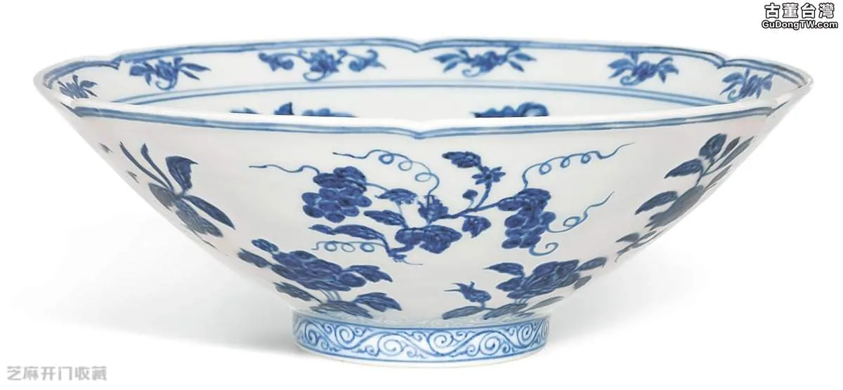 6:明宣德青花折枝花果紋葵口碗,尺寸:22.5厘米,估價:HKD 4,800,000 ~ 5,800,000,成交價: HKD 11,480,000 ,成交時間:2016.04.06,拍賣公司:香港蘇富比拍賣有限公司,拍賣專場:2016年春季拍賣會。