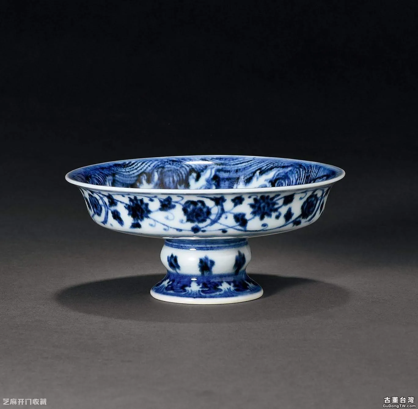 2:明宣德青花纏枝花卉紋高足盤,尺寸:13.2×6厘米,估價:RMB 2,600,000 ~ 3,600,000,成交價: RMB 4,197,500 ,成交時間:2019.11.16,拍賣公司:北京誠軒拍賣有限公司,拍賣專場:2019年秋季拍賣會。