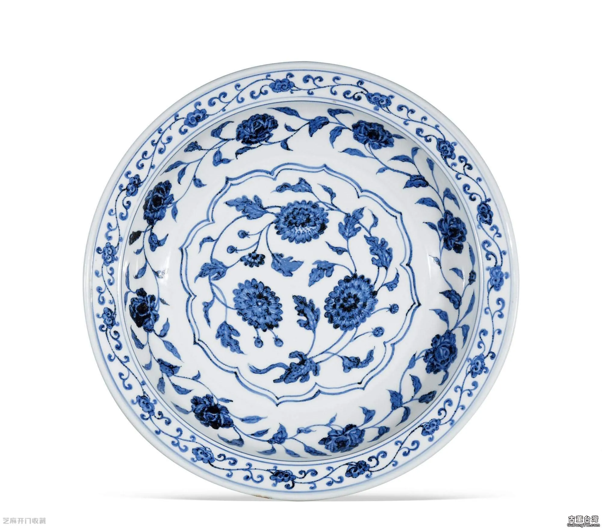 3:明永樂青花纏枝花卉紋折沿大盤,尺寸:直徑37.5厘米,估價:RMB 3,800,000 ~ 4,000,000,成交價: RMB 4,140,000 ,成交時間:2019.12.28,拍賣公司:廣州華藝國際拍賣有限公司,拍賣專場:2019秋季拍賣會。