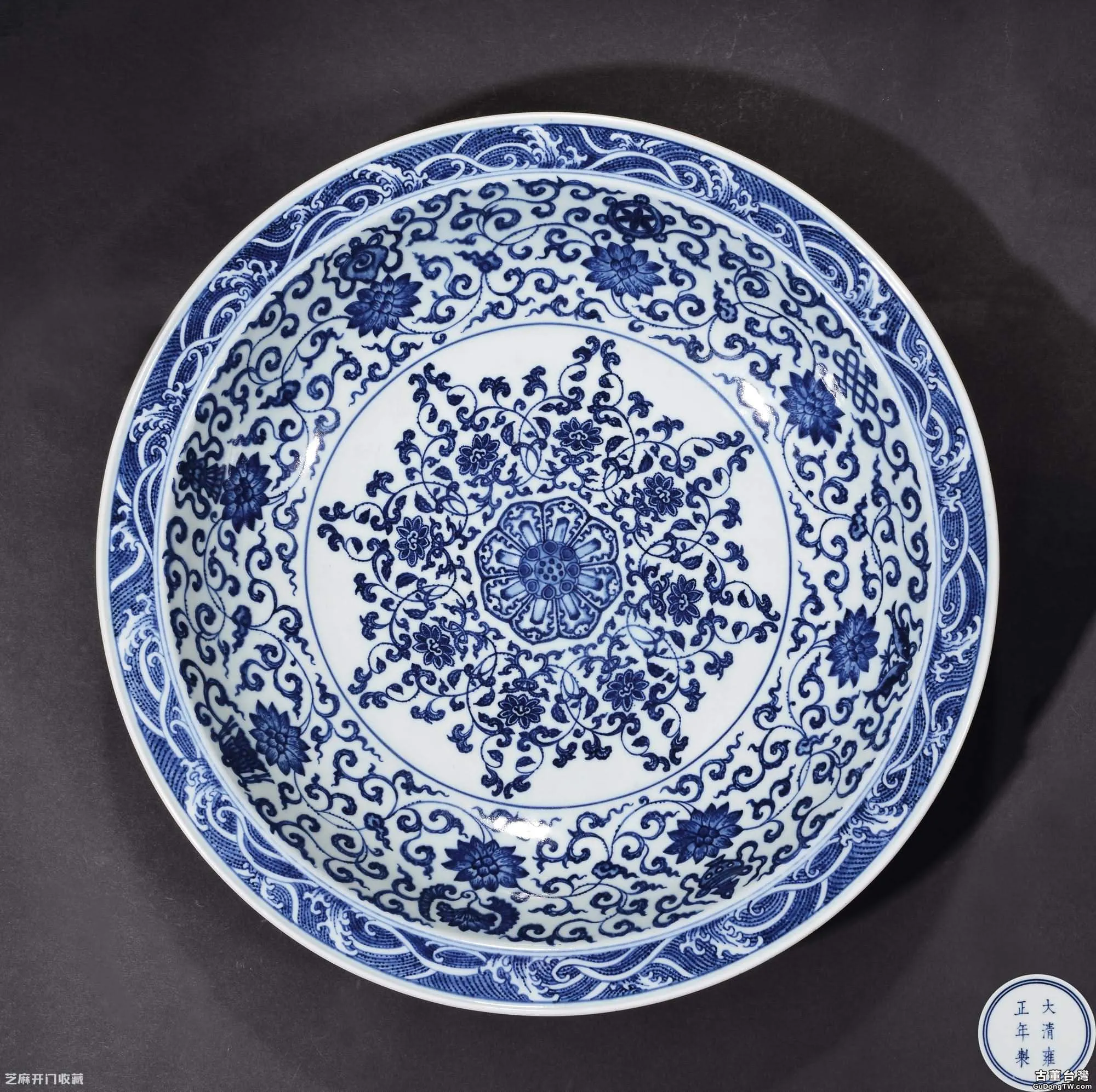 拍品胎骨堅致,釉質瑩潤,青花髮色鮮艷,點染畫法,具有鮮明的景德鎮御窯廠仿明早期青花瓷特點。口沿繪海水浪濤紋,盤心飾蓮心環飾纏枝蓮紋,此乃來源於永宣時期綬帶葫蘆式扁瓶上的紋樣,具有濃郁的伊斯蘭風格。外壁所繪六組折枝花果紋則是對永宣同類大盤的忠實摹仿,而內壁一周纏枝蓮托八寶紋卻是融匯了佛教經典的色彩,這就是雍正皇帝摹古思想的體現,在摹古中創造新意。