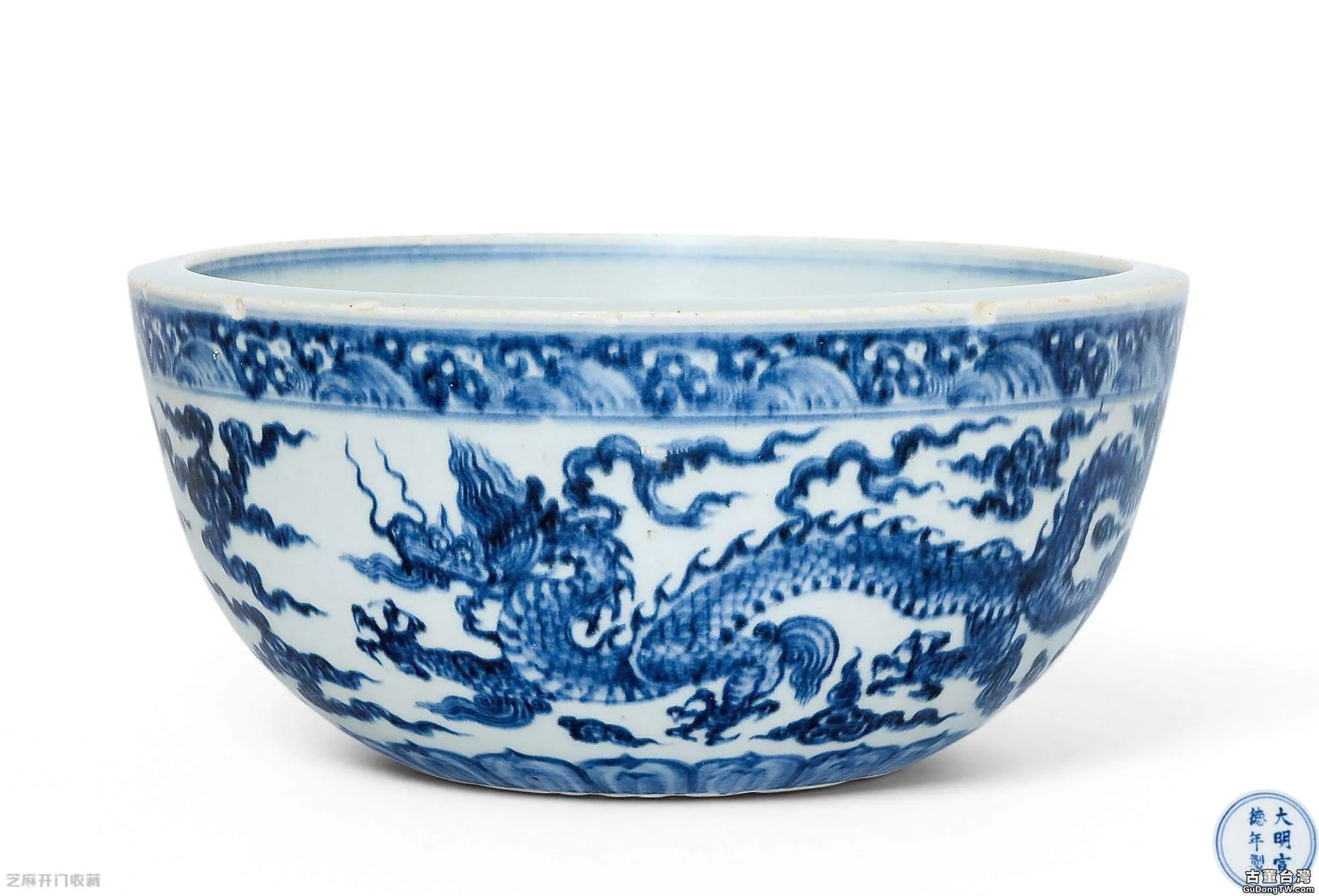 此件缽為厚壁,微撇口,弧腹,臥足。外壁從上至下依次繪海水紋、雲龍紋、蓮瓣紋,龍形威猛,閉口鼓目,為宣德龍紋之典型。口沿繪海水江牙一周,氣勢非凡;缽內施細膩白釉。青花髮色濃艷深沉,所繪雲龍生動繪畫技法嫻熟,青花線條凹陷深入胎骨,青花自然暈散,多處現鐵銹斑,胎質滋潤堅實。龍似在蒼茫海中游,龍首鬚髮飄揚,四肢伸張,呼之欲出。宣德時期,有『諸料悉備,青花為貴』之說。宣德時青花多用『蘇麻離青』料,線條間往往有暈散現象,有如水墨畫的墨暈,加上錯落有致的黑色斑點,使畫面產生了非同凡響的藝術效果。