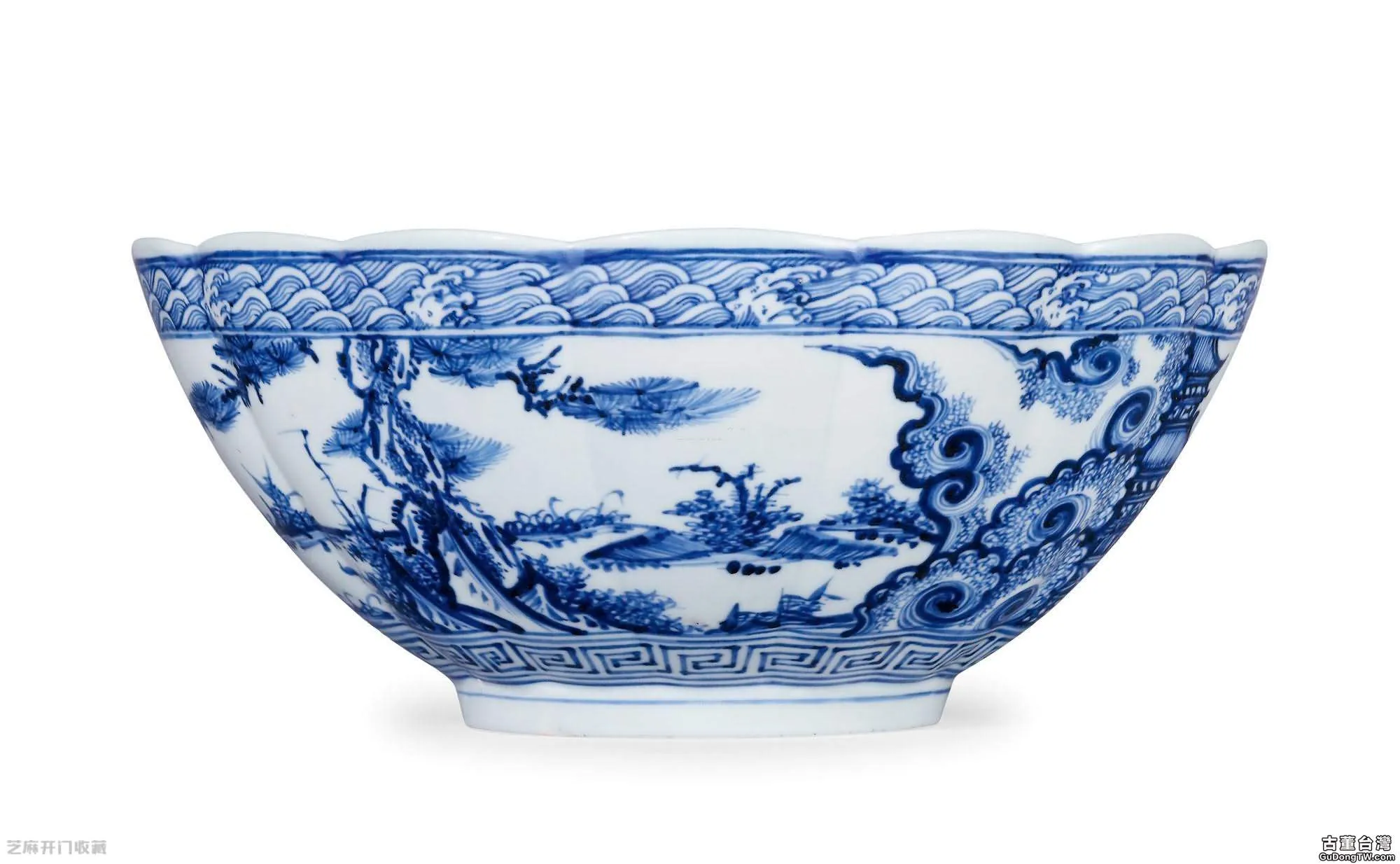 本品正是這一時期民窯高檔器皿的優異代表,此式菊瓣形大碗是正統一朝始見的特色造型,凡此造型的大碗皆是工致質精、青花妍麗之物。其呈十五菊花瓣形,婉轉優美,胎薄質堅,釉質厚潤微泛淡青,外壁上下分別繪以浪濤紋和回紋,中間則是通景仙山樓閣圖,雲氣翻捲,樓閣隱現,芭蕉迭石與欄杆古松分別點綴其中,碗內心繪一高士閒歇溪邊,凝望前方,似深思,似陶醉,予人觀之頓入「坐看雲起時」之空明靜秀的境界。內壁四面對稱繪畫松柏與芭蕉翠竹裝飾,佈局新穎獨特,亦為空白期所僅見之特色。