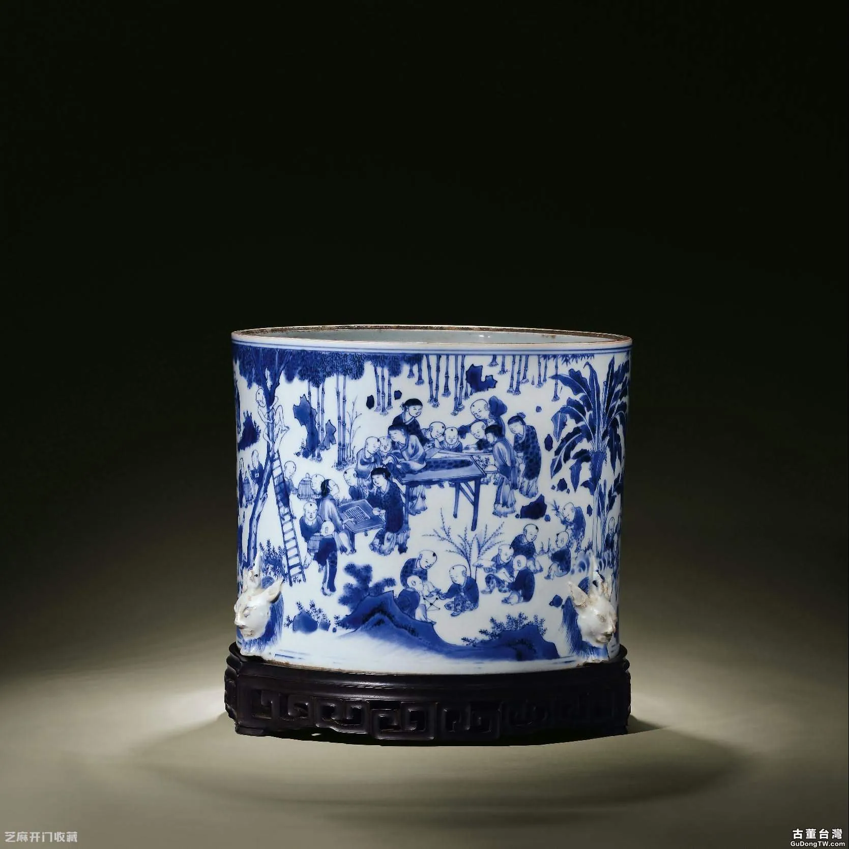備註:廈門文物商店舊藏,明末清初時期景德鎮窯業製作展現出嶄新的時代風貌,瓷器的諸多紋飾蘊涵濃厚的文人氣息,題材之特別,內容之豐富,均開一代未有之奇。當時作為高檔瓷器的主要消費群體—文人、官宦,他們的審美觀念深刻地影響了瓷器的造器與裝飾圖案,從而令瓷器成為反映社會變遷的直接載體,明顯地在瓷畫中留下他們的品味。作為文房清玩之一的筆筒,於此時期突破傳統材質的局限,以瓷為胎,開始大肆燒製,並且紋飾題材刻意迎合社會風尚的需求。其中以人物類的題材最具特色,體現出高超的制瓷水平與鮮明的文人意趣。對此,晚清寂園叟於《匋雅》捲上有評:「明瓷青花人物,以筆筒花觚為甚詼詭」、「明瓷青花筆筒,往往凹雕一圍填以影青。畫筆工給無款識,瓶觚亦然」。且據相關歷史資料證實,此類大筆海,現存世極為稀少,故為極其罕見的百子戲嬰巨幅青花圖作品。 此件筆海週身筆直,體型碩大,口沿一周無釉,底部堆塑辟邪瑞獸形足,為目前所見瓷製的最大形筆筒。週身畫八十七個童子,琴棋書畫、放風箏、演戲、捉迷藏等,眾童子神態生動,栩栩如生,青花青翠艷麗,為青花筆筒之極品,極為罕見。此品種並非明晚期流行的筆筒式樣,更加珍罕;通體施白釉,外壁通景式佈局,以青花繪百子嬰戲圖景。其胎色白淨,釉質晶瀅,釉色白中閃青,青花色料採用石子青,呈色穩定,青花髮色青翠艷麗。百子圖顧名思義,有祈求多子多孫,人丁興旺之意。此件筆海呈色艷麗而沉著,構圖錯落有致,層次分明,人物眾多,場景,山石,樹木以及孩童衣著款式、顏色、遊戲的內容多變,輪廓線條清晰。全景猶如一幅長卷的風俗畫,筆意生動,筆觸纖細精緻,青花髮色鮮麗明快,具有明、清交替的時代特徵,為崇禎青花頂級上品。 明末清初之際,戰亂頻發,人口急遽大量減少,景德鎮官窯處於停廢狀態,僅有民窯繼續生產,崇禎青花正處於從萬曆後期到清康熙前期的轉折點,許多畫家去景德鎮謀生,以泥刀代筆,出現了許多驚世之作,對這個時期的瓷器一般有細器和粗器之分。 在此種社會背景下,以求子繁衍為主題的瓷器裝飾題材,承接嘉靖嬰戲圖之風,流行一時,成為十七世紀中國藝術表現的一大特色。明清筆筒為中國古典文房藝術品中極為重要的門類,而明清筆筒的大宗產品當推瓷器,由於其燒造相對簡單,產量高,故傳世品較多。而瓷製筆筒始於明代嘉靖、萬曆年間,但傳世品中極難一見,崇禎筆筒,亦體型款式尤為特殊者,更加稀少。