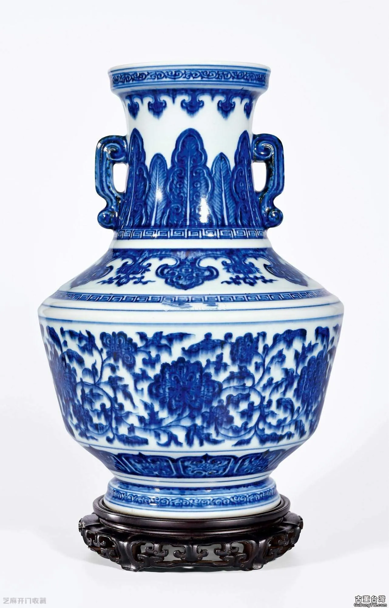此件青花佳作造型端莊,硬折肩式的輪廓線條極具雍正官窯之特色。青花色澤凝重典雅,筆觸精細纖柔。器身份層裝飾回紋、蕉葉紋、纏枝蓮紋、如雲頭紋,注重與器型的完美結合,按照器物的形體,配以疏朗的構圖。外底署「大清雍正年制」六字雙行楷書款。此器制式頸附雙耳者稀少,且多為窯變釉品種,以青花為飾,傳世鮮見。