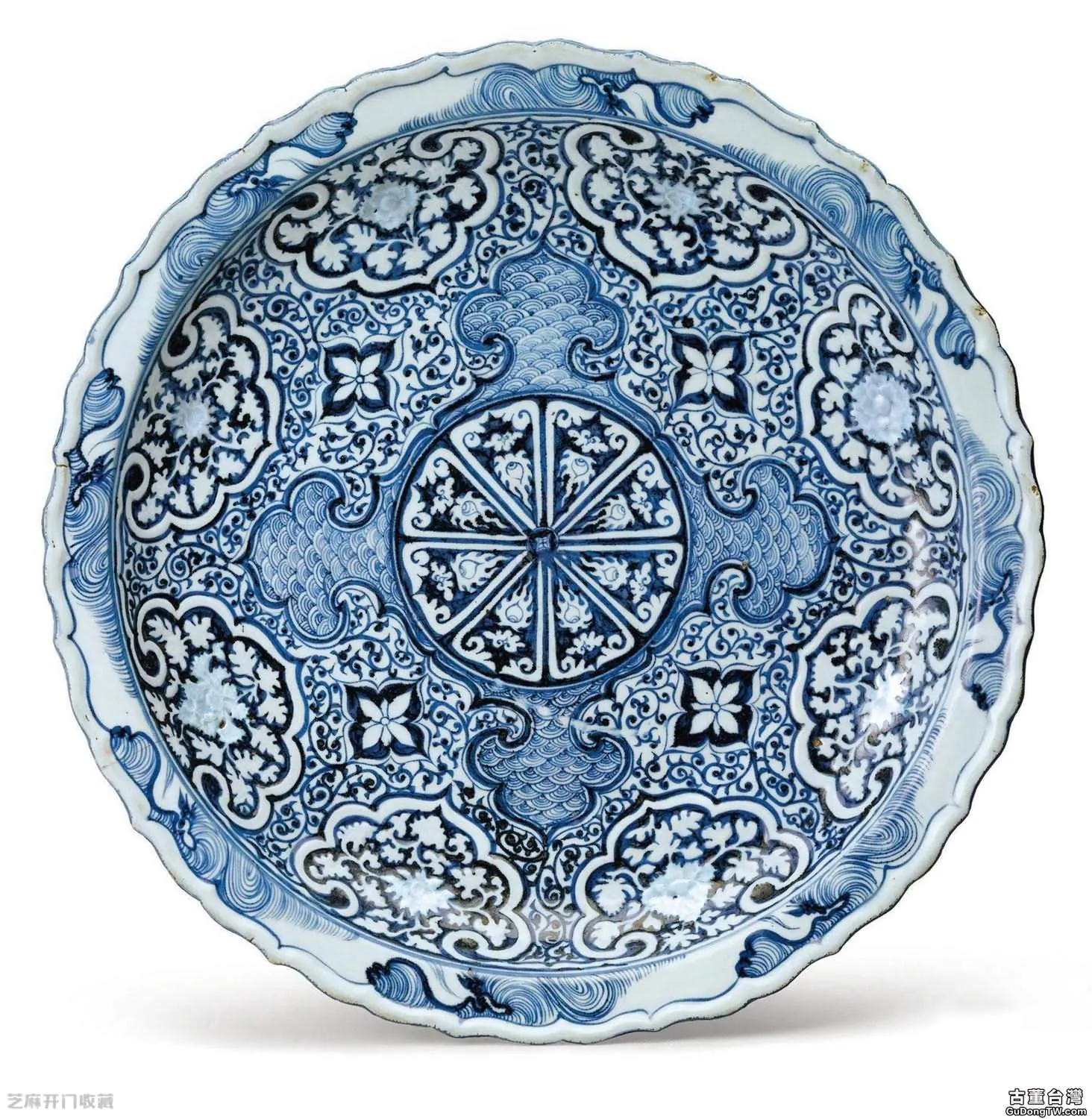 1:元14世紀青花如意印花纏枝牡丹紋菱口盤,尺寸:直徑45.7厘米,估價:USD 200,000 ~ 300,000,成交價: USD 4,197,000 ,成交時間:2014.03.18,拍賣公司:紐約蘇富比有限公司,拍賣專場:2014年3月拍賣會。