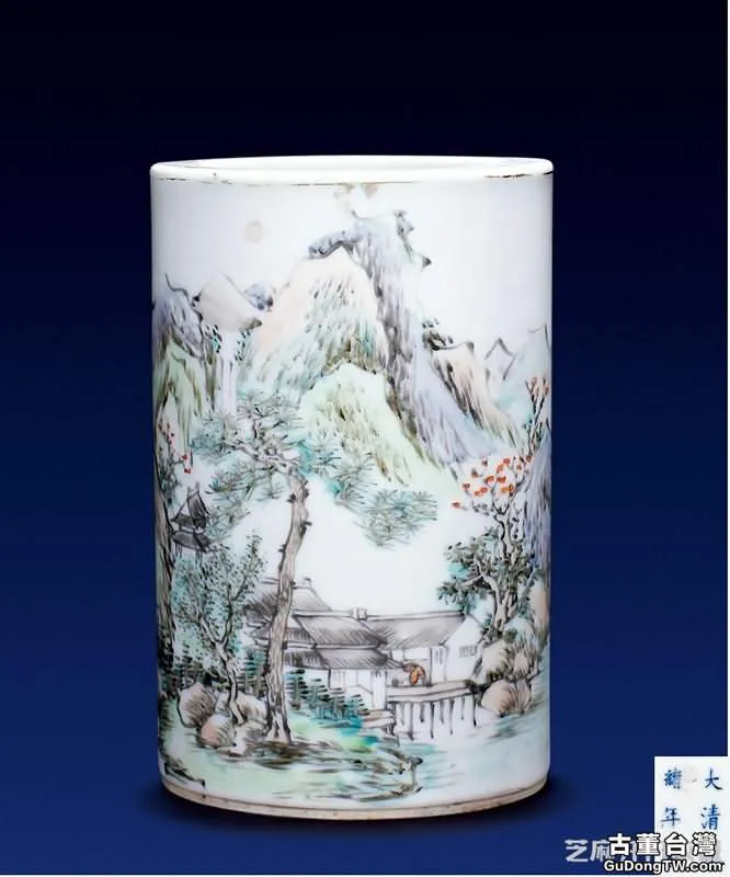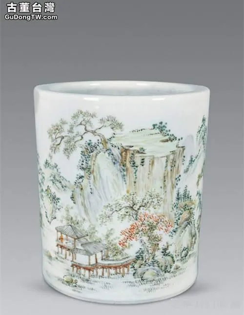 圖1:清光緒 高心田 淺絳彩山水紋筆筒, 拍賣成交價格估計:RMB 40,000-60,000,最終成交價格:RMB 79,450元, 拍賣專場:北京中拍國際拍賣有限公司 2013年春季拍賣會, 拍賣成交時間:2013-06-04, 尺寸:口徑15.3cm。