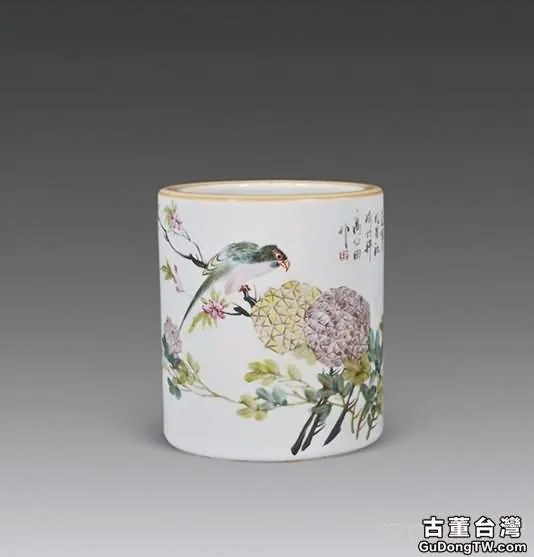 圖4:清 高心田款淺絳彩花鳥紋筆筒, 最終成交價格:RMB 3,450元, 拍賣專場:中國嘉德國際拍賣有限公司 嘉德四季第三十五期拍賣會, 拍賣成交時間:2013-09-17, 尺寸:高13.7cm。