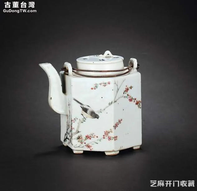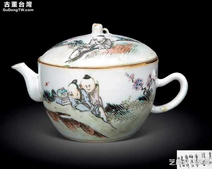 圖7:清光緒 高心田淺絳彩覆鍾形茶壺, 拍賣成交價格估計:RMB 2,000-5,000, 拍賣專場:盤龍企業拍賣股份有限公司浙江分公司 2005秋季拍賣會, 拍賣成交時間:2005-12-16, 尺寸:高15cm。