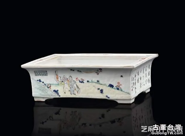 圖8:清光緒19年(1893) 高心田 淺絳彩花鳥人物水仙盆, 拍賣成交價格估計:RMB 20,000-30,000,最終成交價格:流拍元, 拍賣專場:北京保利國際拍賣有限公司 2014秋季拍賣會, 拍賣成交時間:2014-12-02, 尺寸:23×15×7cm。