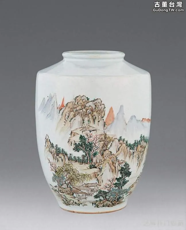 圖9:清光緒 高心田淺絳彩山水瓶, 拍賣成交價格估計:RMB 8,000-20,000, 拍賣專場:盤龍企業拍賣股份有限公司浙江分公司 2005秋季拍賣會, 拍賣成交時間:2005-12-16, 尺寸:高30.5cm。