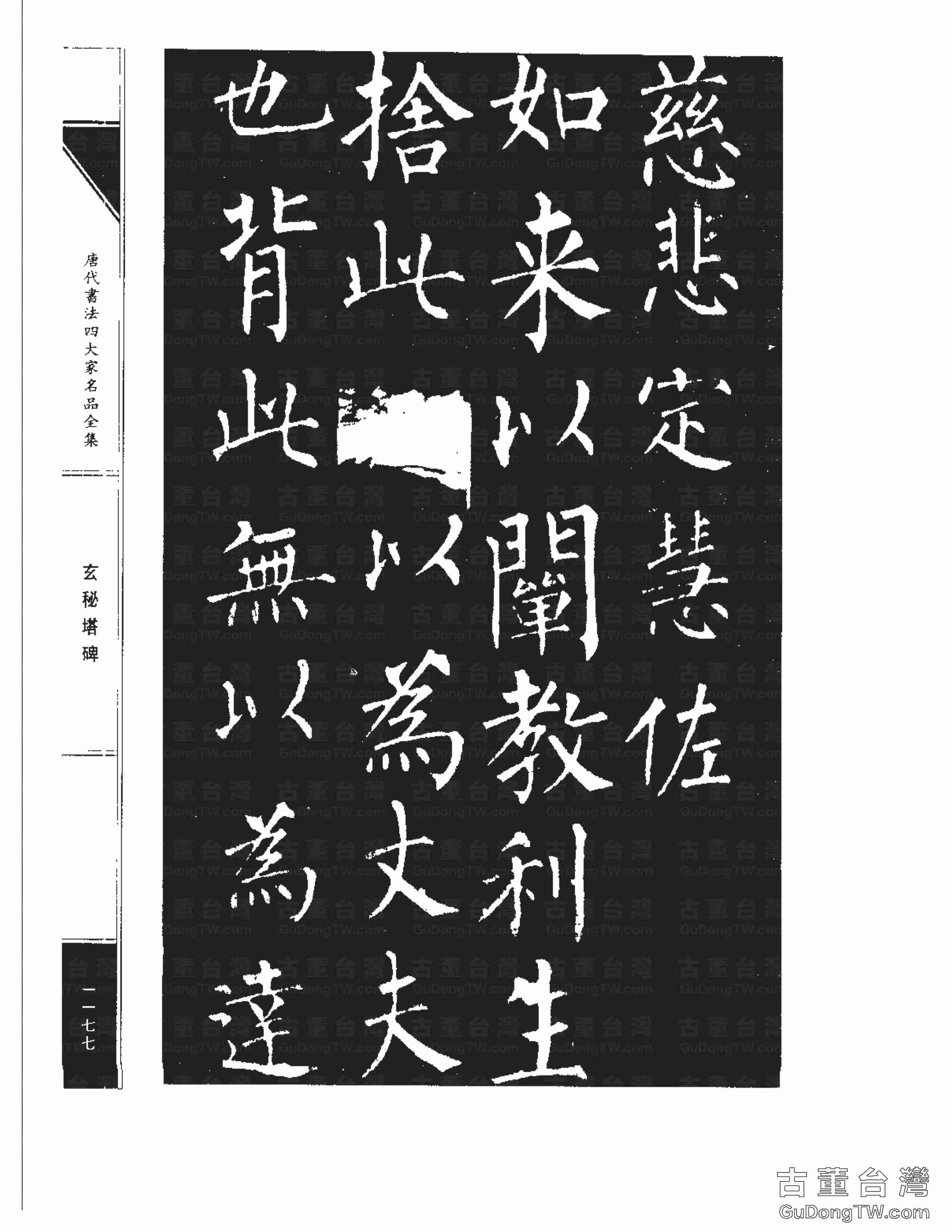《玄秘塔碑》全篇佈局嚴謹勁健,章法上行間茂密,精妙高雅。左右基本對稱,右肩稍高,形成左低右高之勢,險中求穩。其字裡行間,充滿了行與留、曲與直、違與和、動與靜、剛與柔、擒與縱、欹與正、虛與實。其勁、其秀,骨強筋健不失膚肉豐潤;其姿、其態,天然巧成不失純正規範。