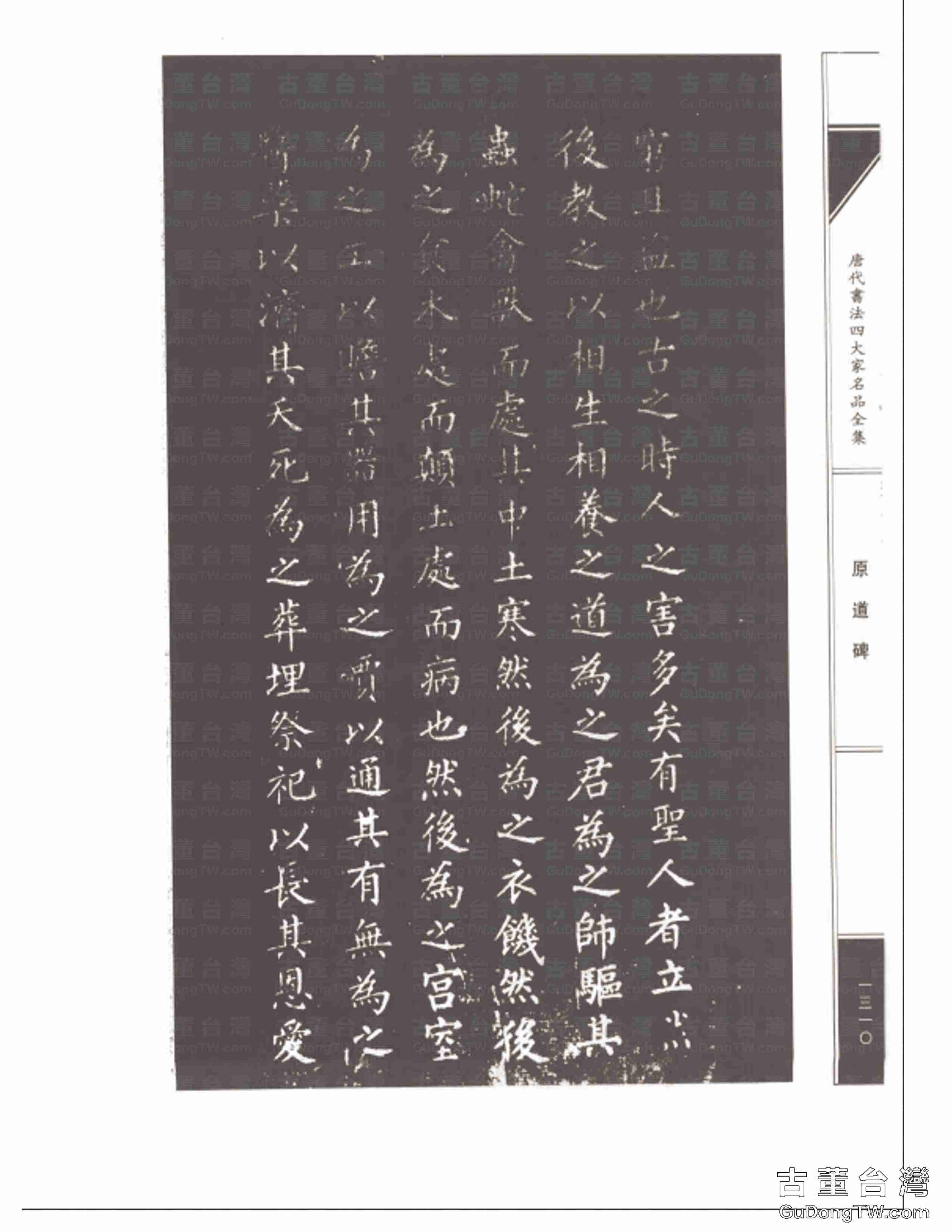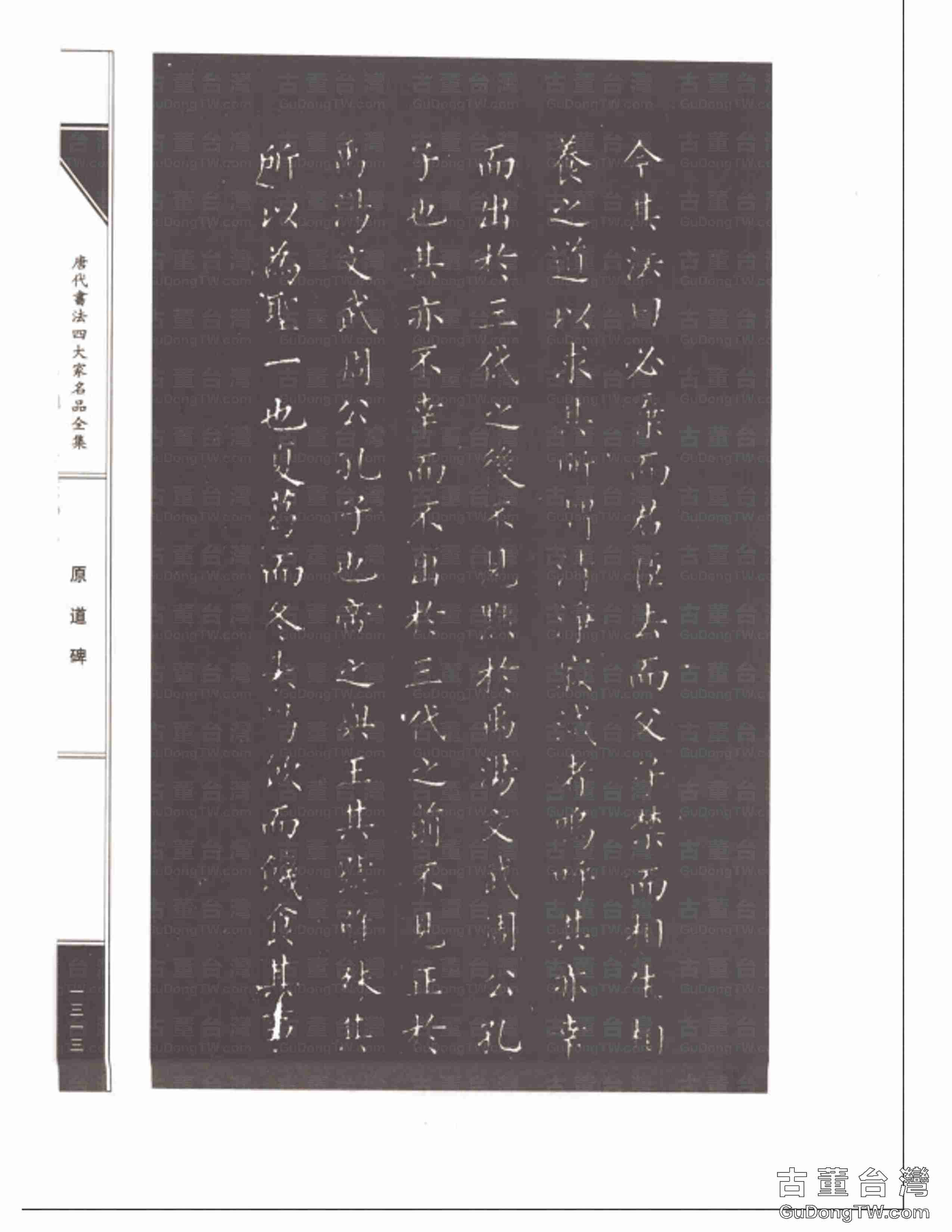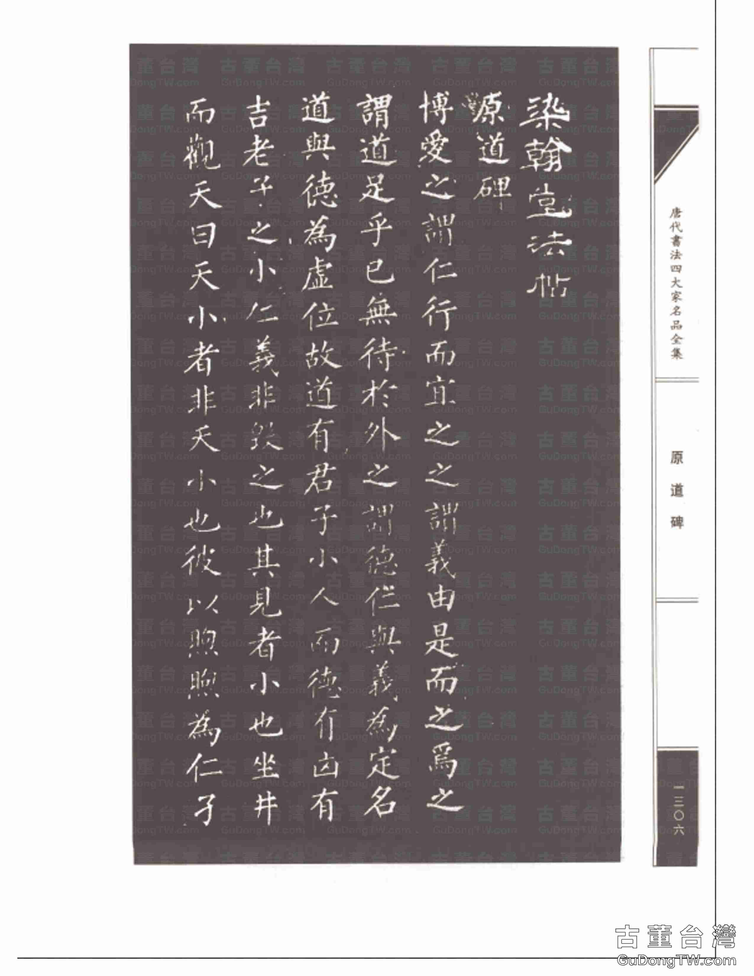 《原道碑》是柳公柳所書的較為罕見的小楷,作品風格剛健俊拔,字體遒勁豐潤,此碑雖流傳較少,但頗受歡迎。《原道》是唐代大文學家韓愈復古崇儒、攘斥佛老的代表作。文中觀點鮮明,有破有立,引證今古,從歷史發展、社會生活等方面,層層剖析,駁斥佛老之非,論述儒學之是,歸結到恢復古道、尊崇儒學的宗旨。
