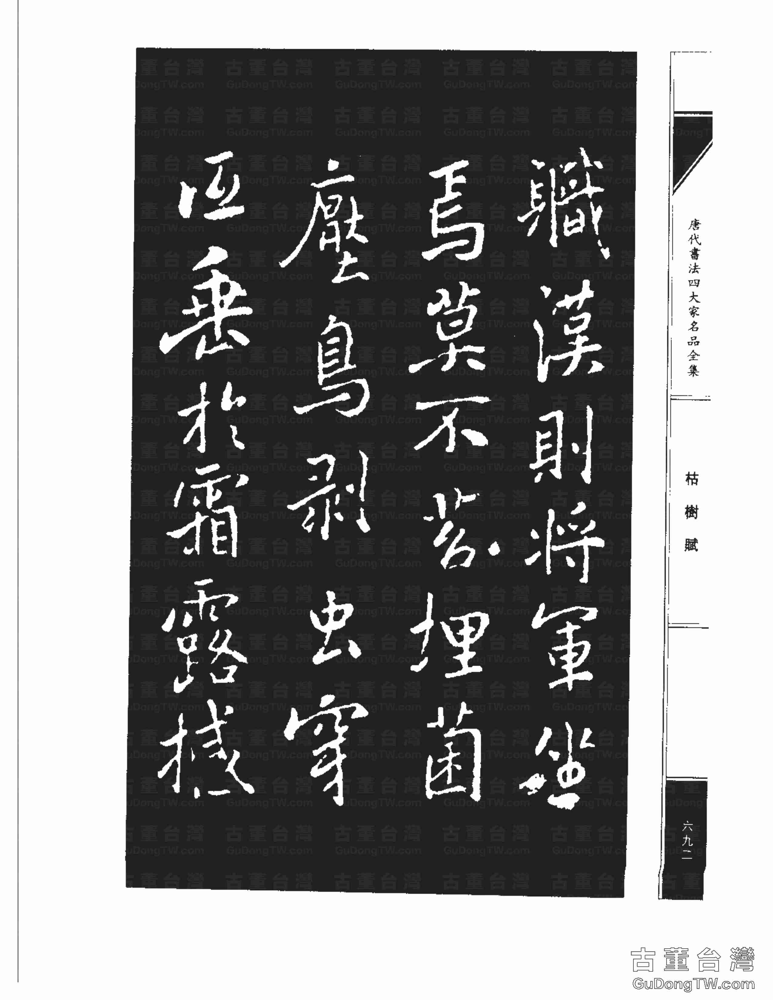 褚遂良書法欣賞《枯樹賦》僅有刻本傳世。款題貞觀四年書。共三十九行,計四百六十七字。書勢倚正縱橫,錯綜變化,《聽雨樓帖》、《玉煙堂帖》、《戲鴻堂帖》、《鄰蘇園帖 》等均收入, 而以《聽雨樓帖》所刻為精。
